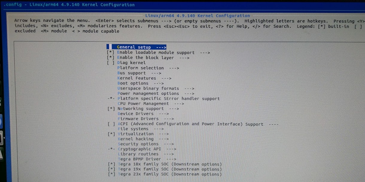 Now we need to change the kernel config, and since we’re using a GUI desktop environment on the Nano, we can just use menuconfig: