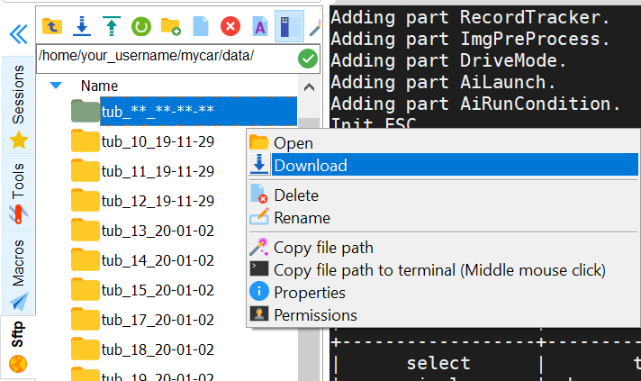 /home/your_username/mycar/data/ using the SFTP viewermycar directory on your host PC (should be at C:\Users\your_username\mycar\)